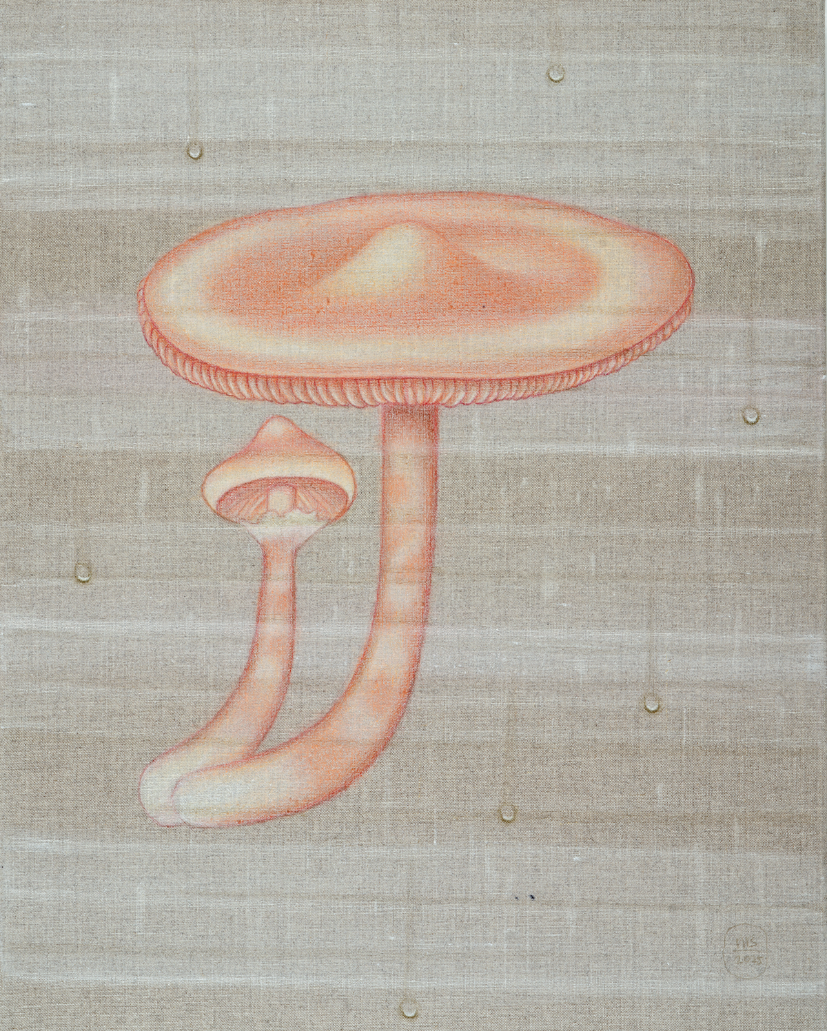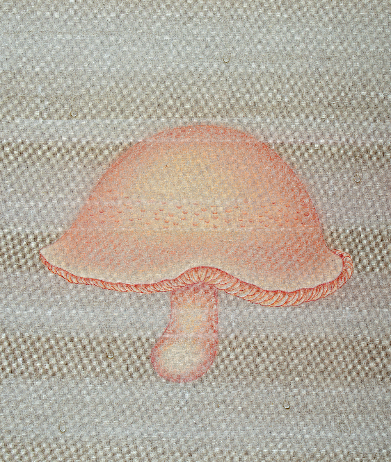 Each artist develops a distinct territory through precise iconographies: Böhmer’s fungal beings divert scientific illustration toward ambiguous corporeal forms; Benjumea’s character Jiko structures an autobiographical imaginary; in Regueira’s work, landscape shifts toward a symbolic and oneiric dimension; while in Sintura’s practice, the image appears suspended, anchored in memory. Through a sustained pictorial and material exploration, each artist immerses the spectator in their own universe.