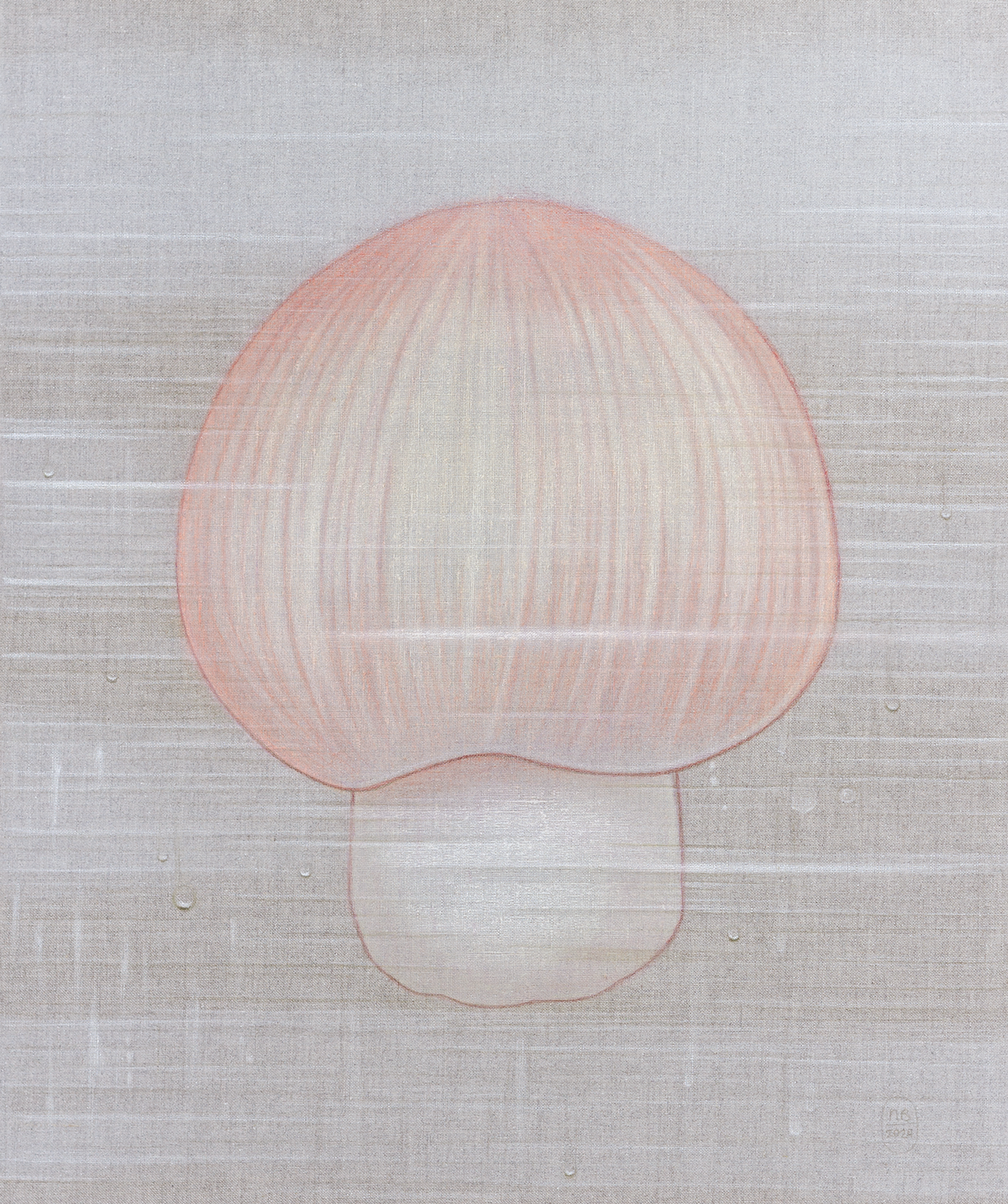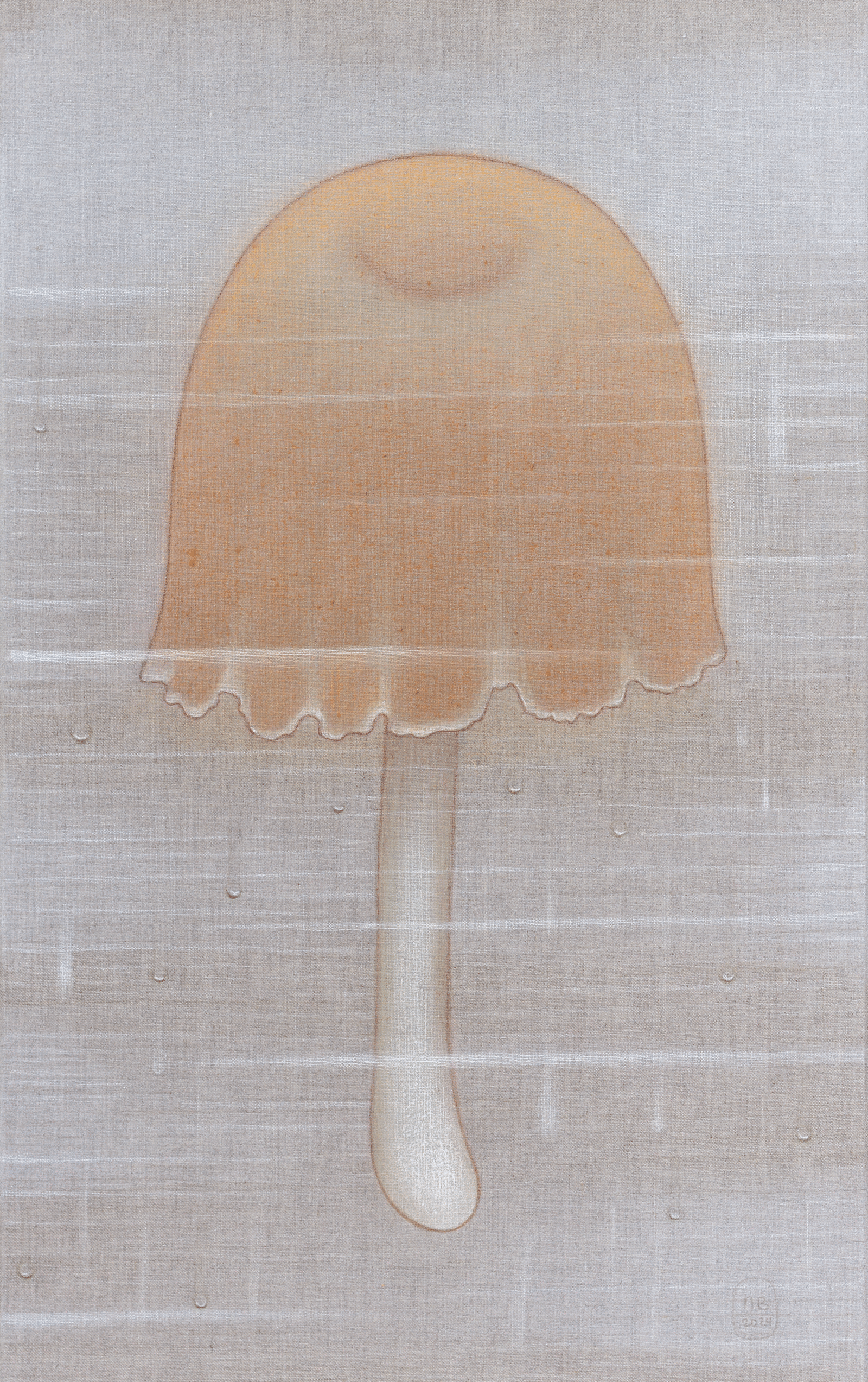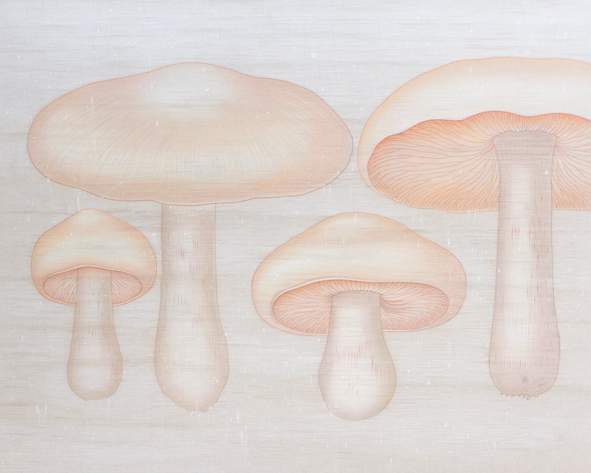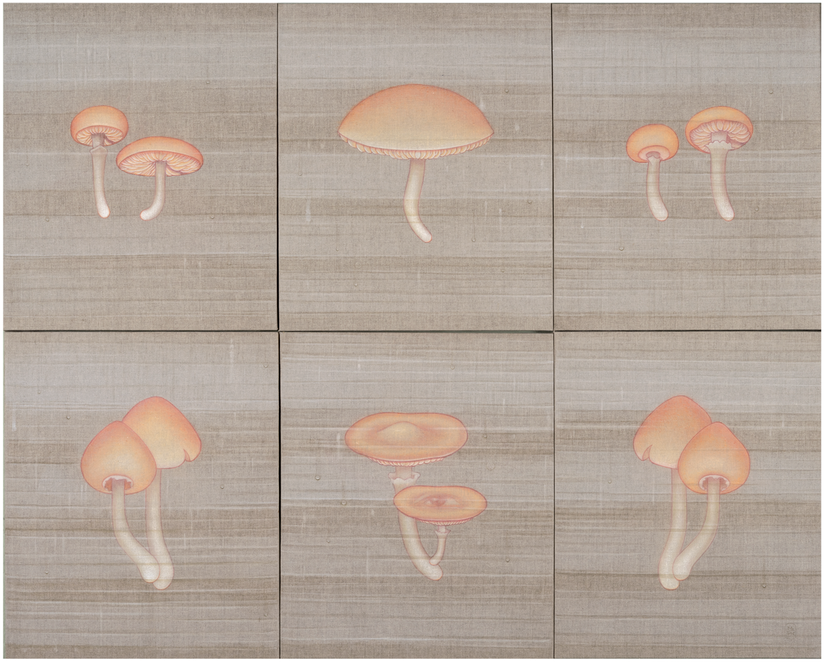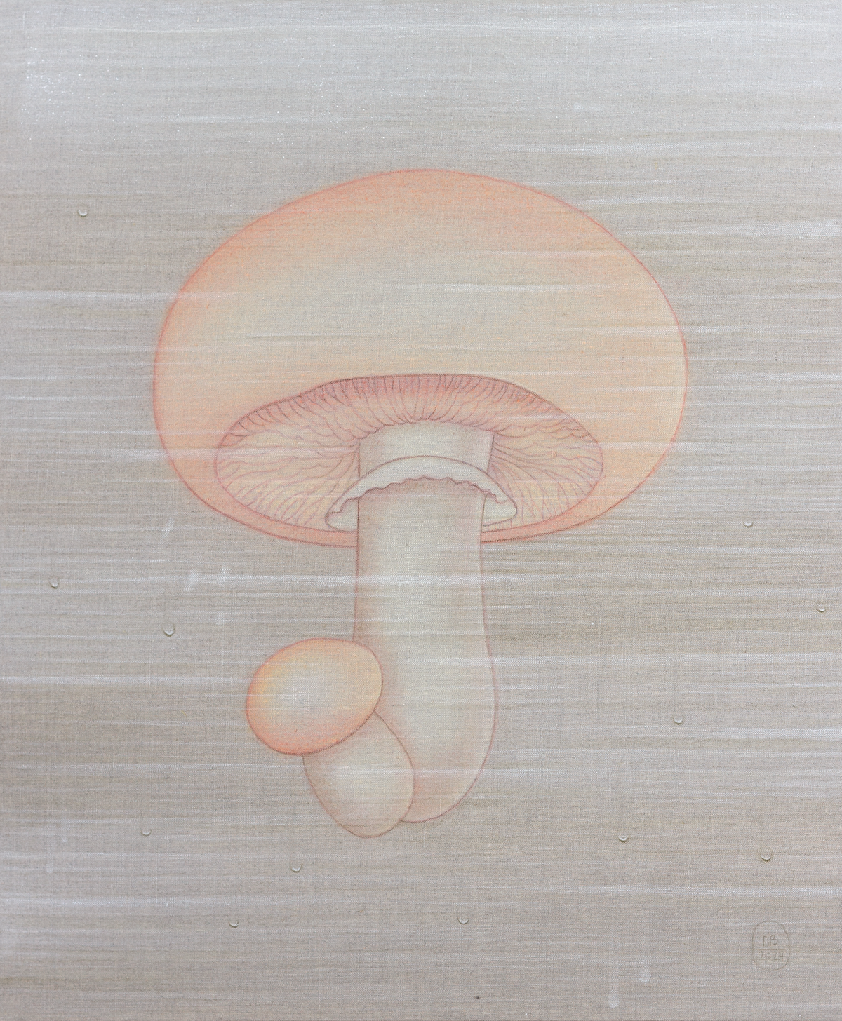 La humedad, representada a través de veladuras y brumas, acentúa la sensación de una superficie viva, que respira y vibra con su entorno. En esta nueva serie, los champiñones emergen como un motivo central, sus tonos piel evocando una presencia humana sutil y ambigua. Su representación oscila entre lo seco y lo húmedo, lo estático y lo mutable, en un delicado equilibrio donde la materia y la luz se entrelazan.