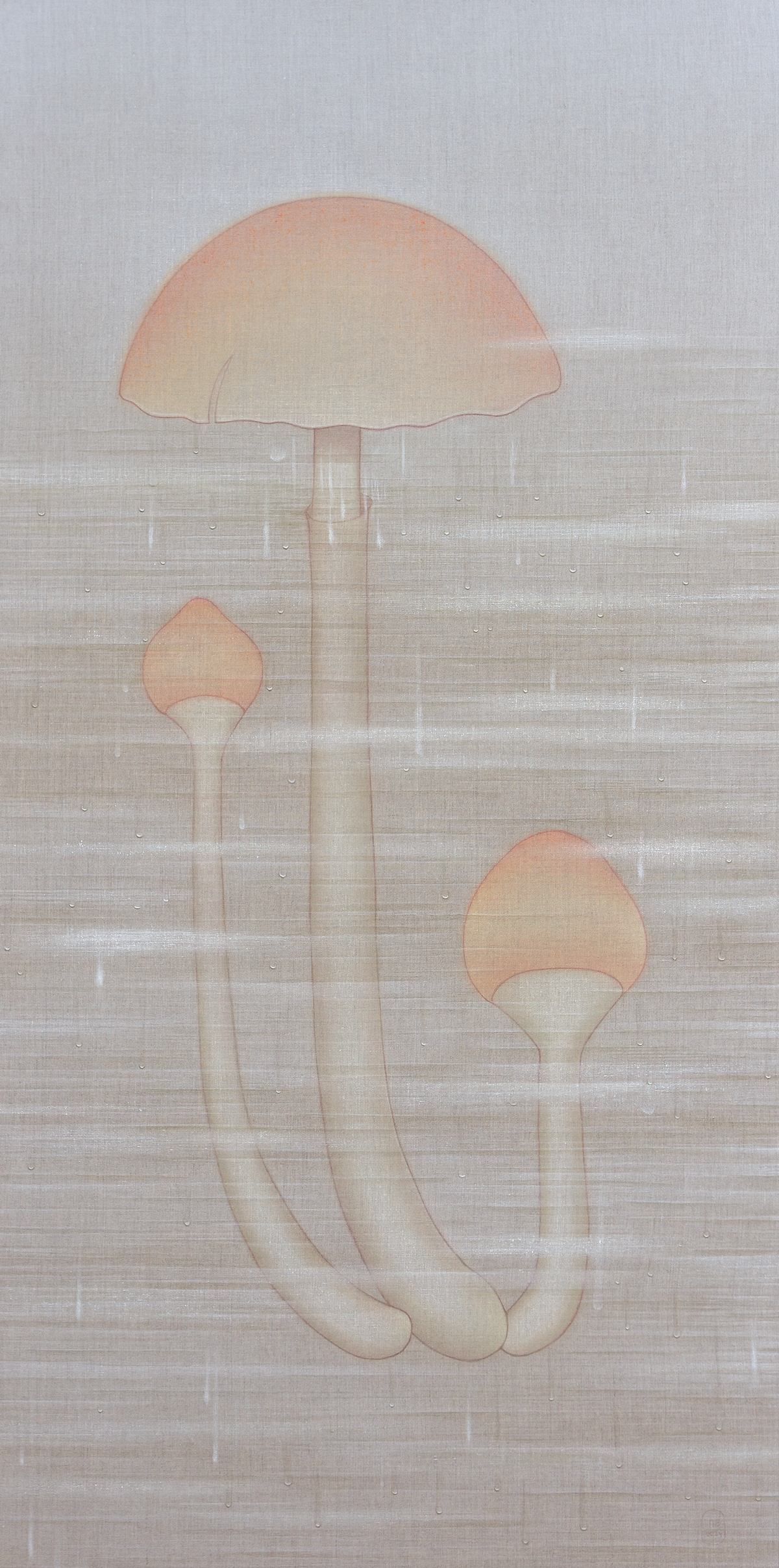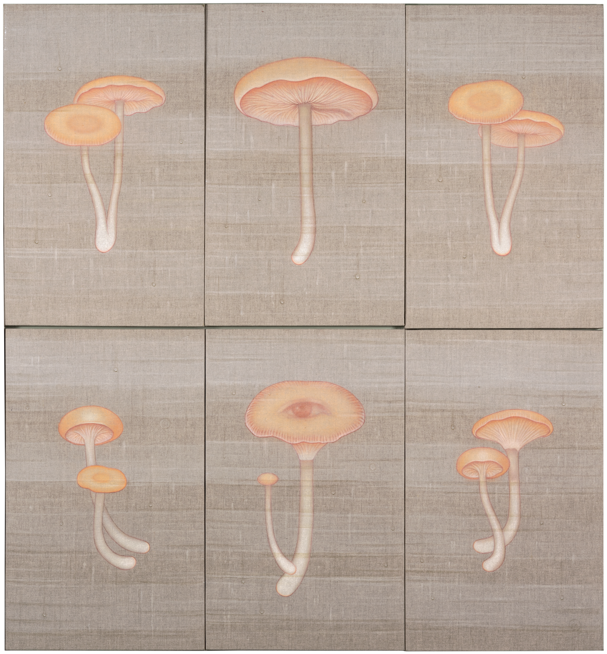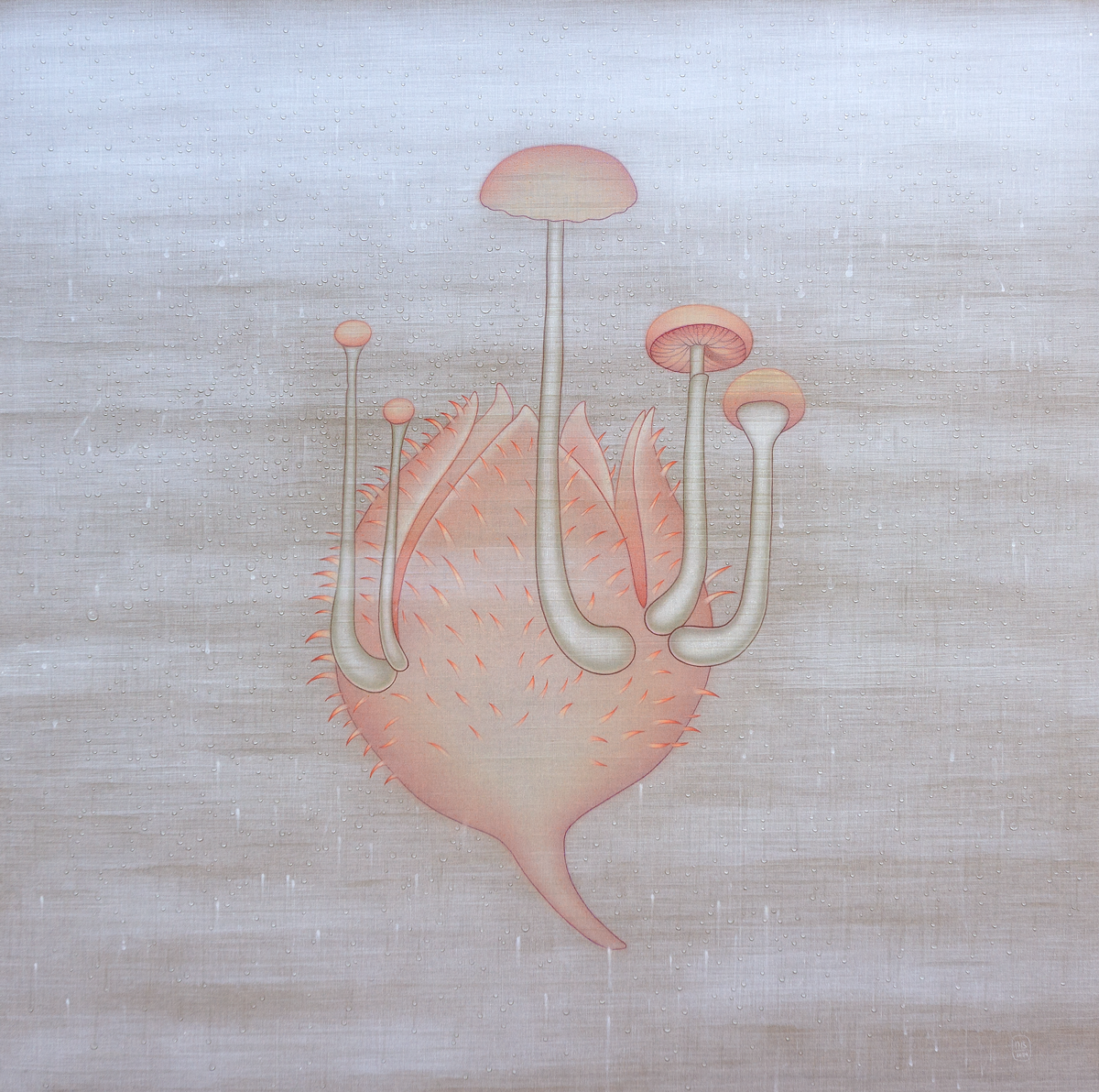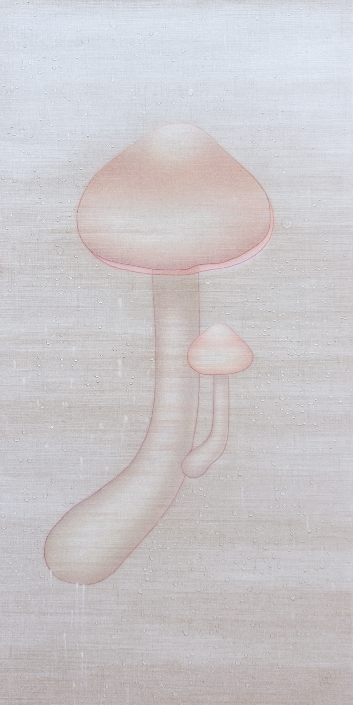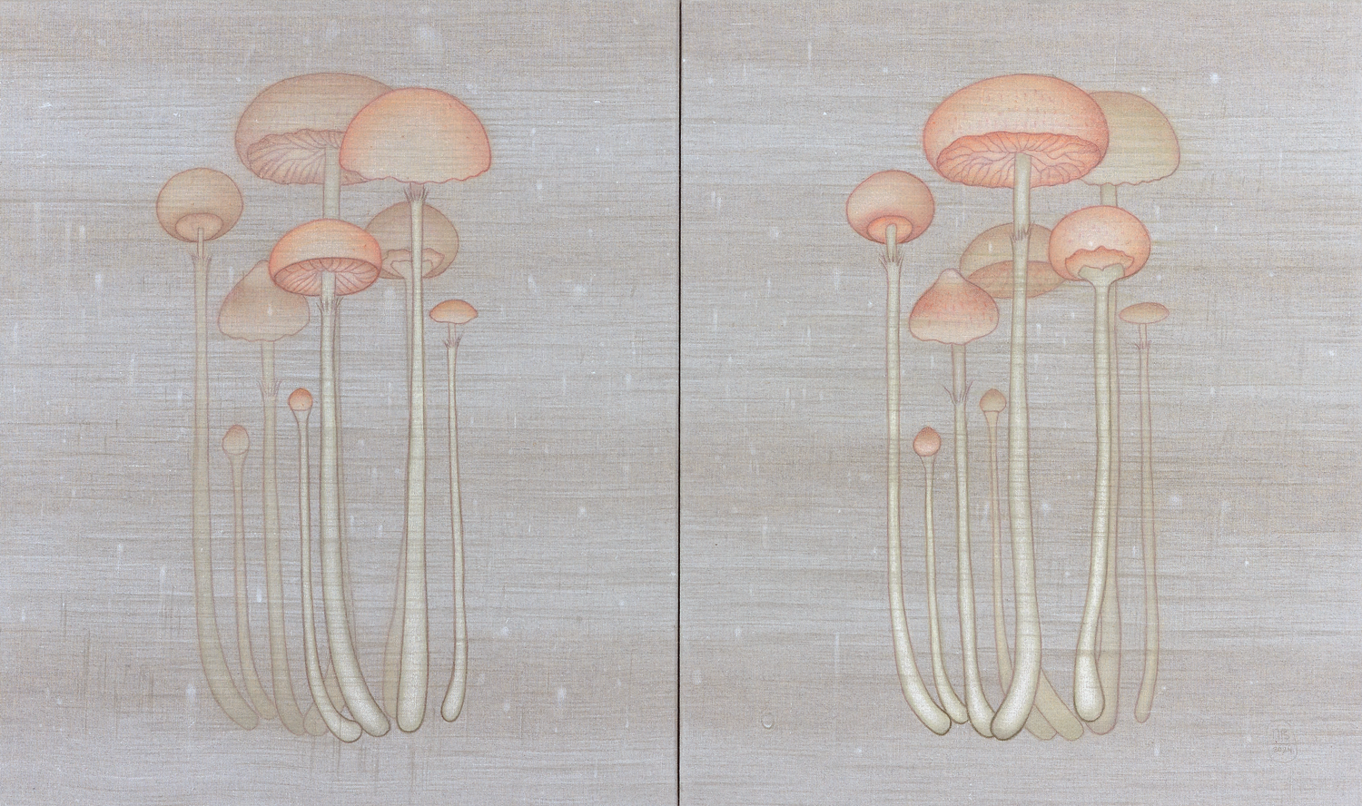 La humedad, representada a través de veladuras y brumas, acentúa la sensación de una superficie viva, que respira y vibra con su entorno. En esta nueva serie, los champiñones emergen como un motivo central, sus tonos piel evocando una presencia humana sutil y ambigua. Su representación oscila entre lo seco y lo húmedo, lo estático y lo mutable, en un delicado equilibrio donde la materia y la luz se entrelazan.