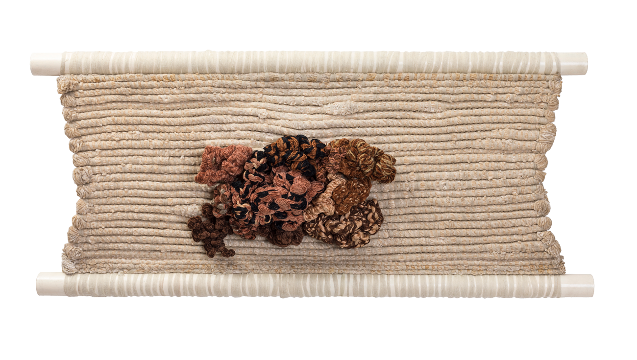 Chenille, acrylic fiber, silk and wood